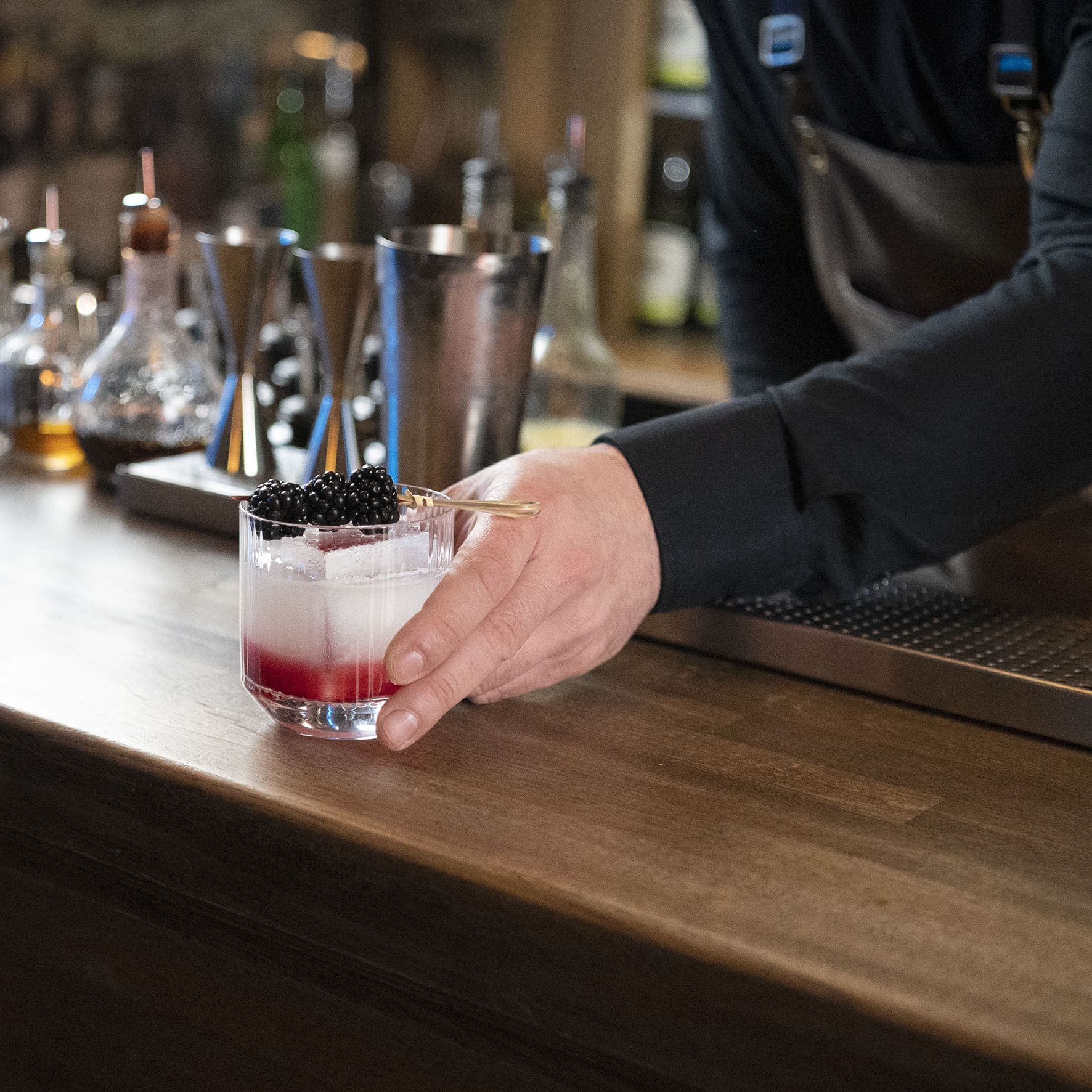 Der Brumble Gin Cocktail setzt ganz auf die Brombeere, die mit ihrem fruchtigen Aroma und der satten Farbe den Ton angibt. Der Brombeerlikör wird langsam ins Glas gegossen, sodass er sich am Boden absetzt und mit Zitronensaft sowie Zuckersirup eine erfrischende, süße Note erhält. Abgerundet wird der Drink mit frischen Brombeeren am Spieß – ein perfekter sommerlicher Cocktail für jede Gartenparty!